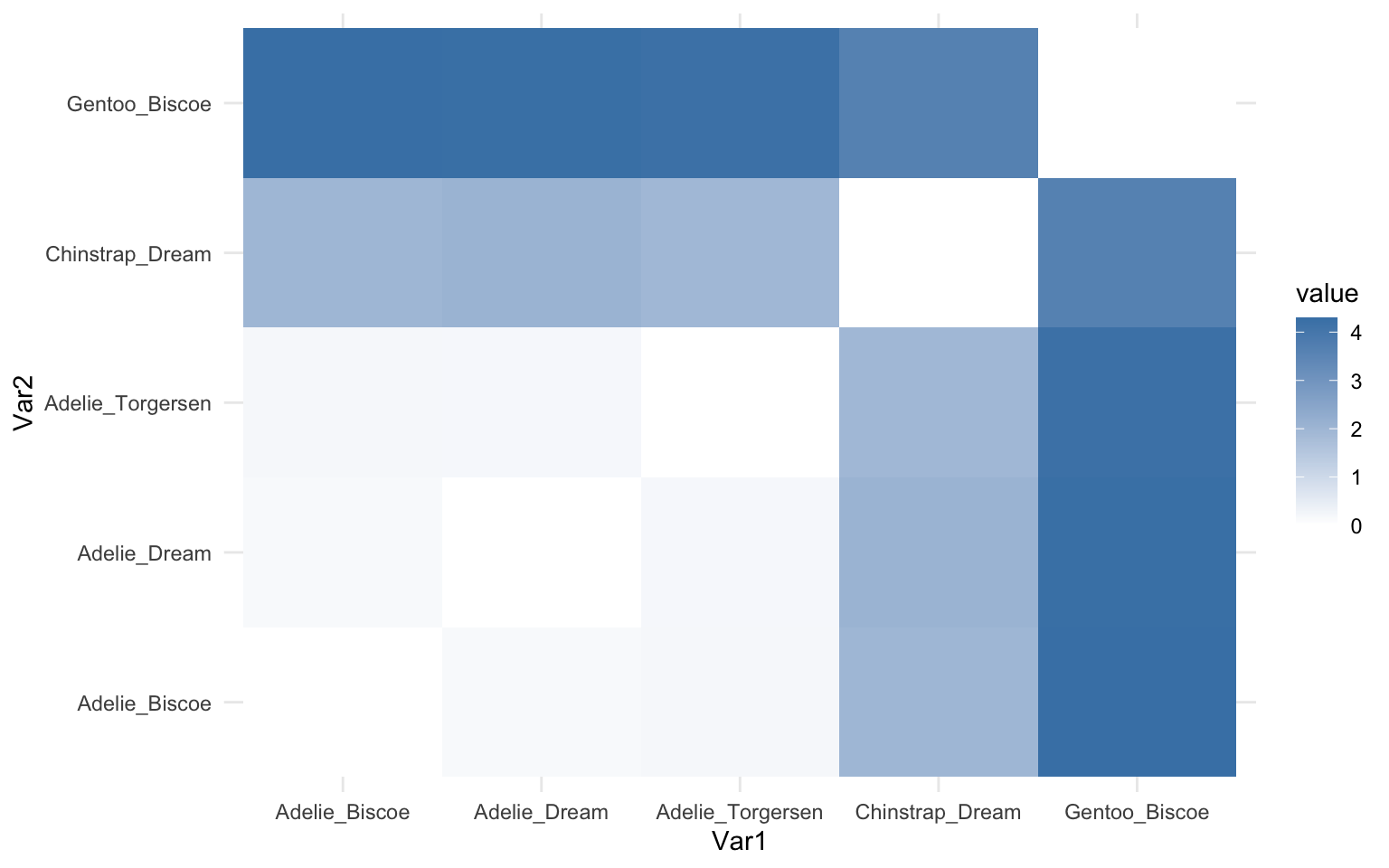 En fonction des variables disponibles dans cette base de données, on peut se poser une première question très simple : quelles espèces de manchots se ressemblent le plus ? Tel que mentionné dans la section Théorie, les distances euclidiennes constituent une analyse très simple qui requiert toutefois un peu de réflexion en amont. Pour répondre à notre question, nous allons considérer que les espèces sont les points entre lesquels nous mesurons les distances, et que les quatre variables de mensuration décrivent ces points.