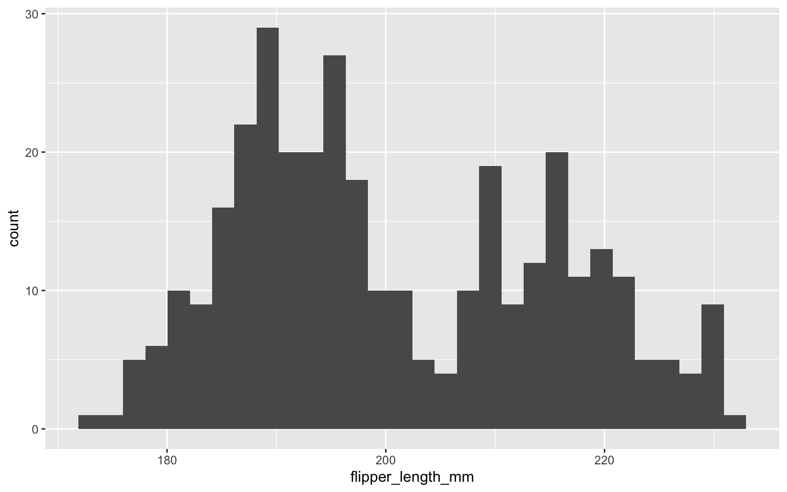 geom_histogram(aes(flipper_length_mm))