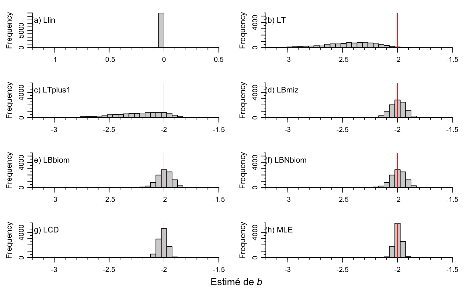 ll peut arriver qu’on a des méthodes d’échantillonnage qui sous-estiment certaines classes de tailles. Par exemple, les mailles d’un filet laissent passer les plus petits poissons. Que faire? On peut effectuer une simulation pour voir comment l’estimation de $b$ change en fonction de si on décide d’inclure les classes de tailles sous-estimées vs lorsqu’on retire ces classes de tailles.