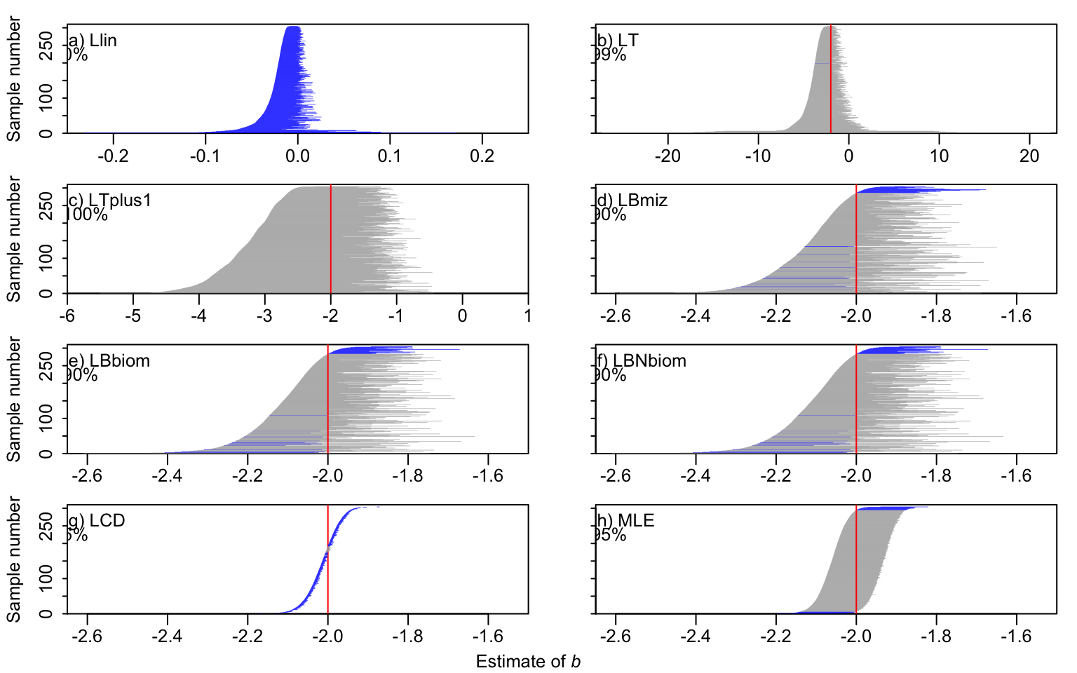 Ensuite, nous explorerons les 8 méthodes historiquement développées pour quantifier la pente d’une communauté et apprendrons à les appliquer à nos propres données grâce au package R sizeSpectra.