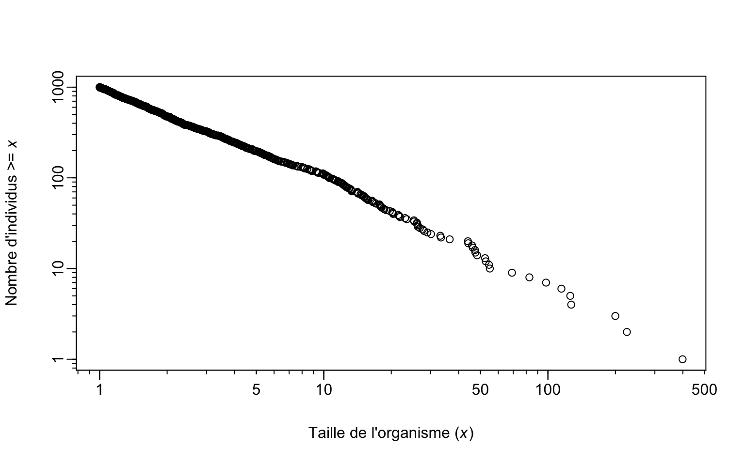 L’étape suivante est de générer un jeu de données théoriques de tailles qui suivent une loi de puissance. L’objet “X” correspond à un vecteur de tailles/masses d’organismes vivants.
