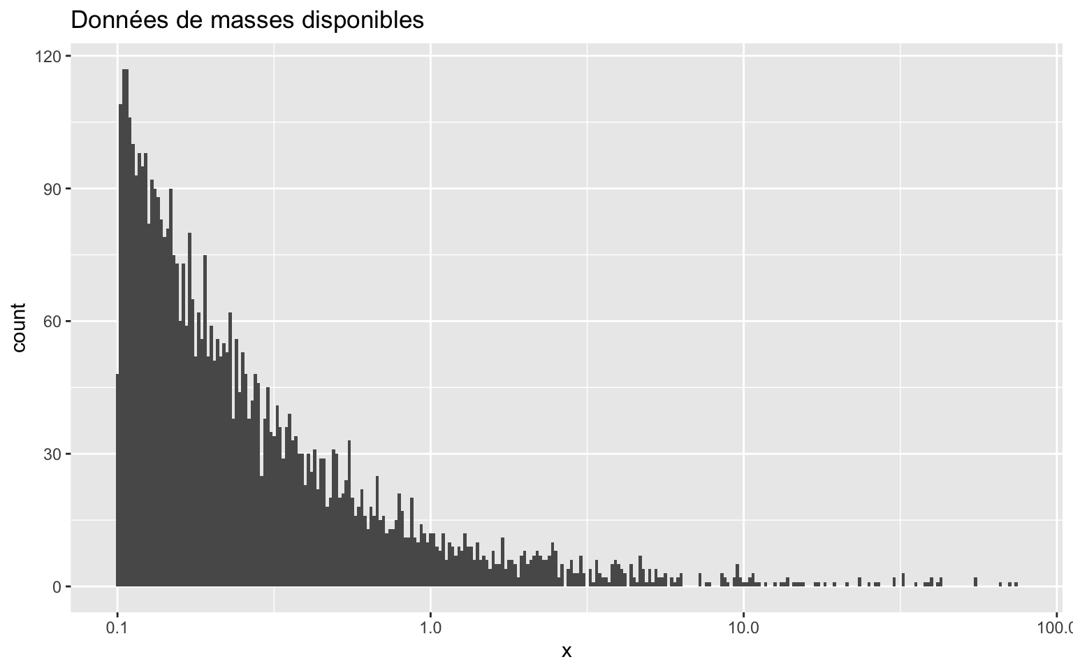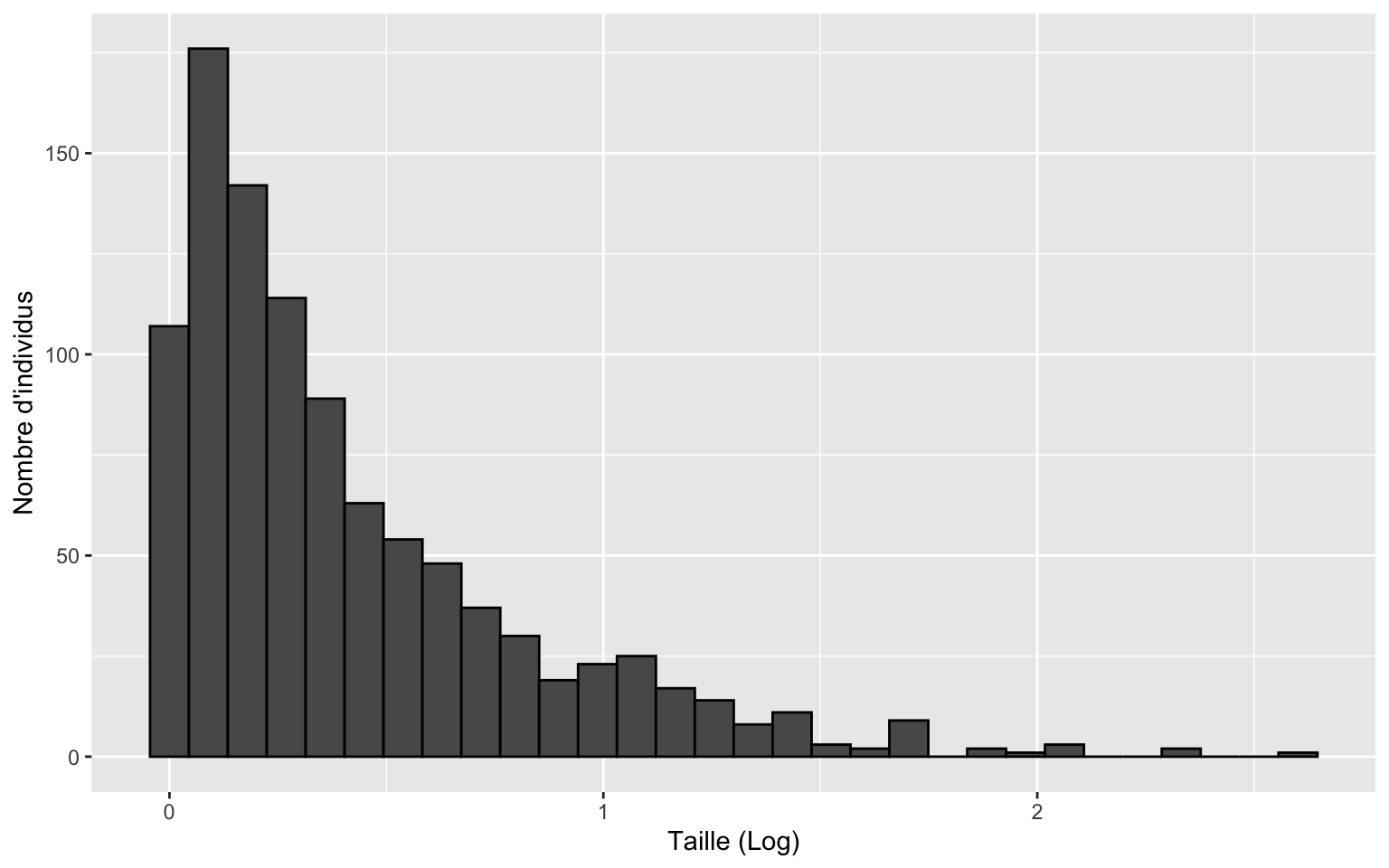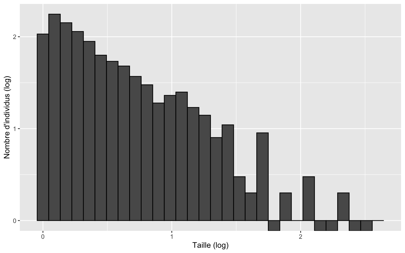 L’histogramme ci-haut n’est pas très informatif. La majorité de la communauté est compressée dans une seule bande. Les gros individus sont très rares. Sur une échelle linéaire, leur fréquence est si basse que les barres correspondantes sont invisibles.