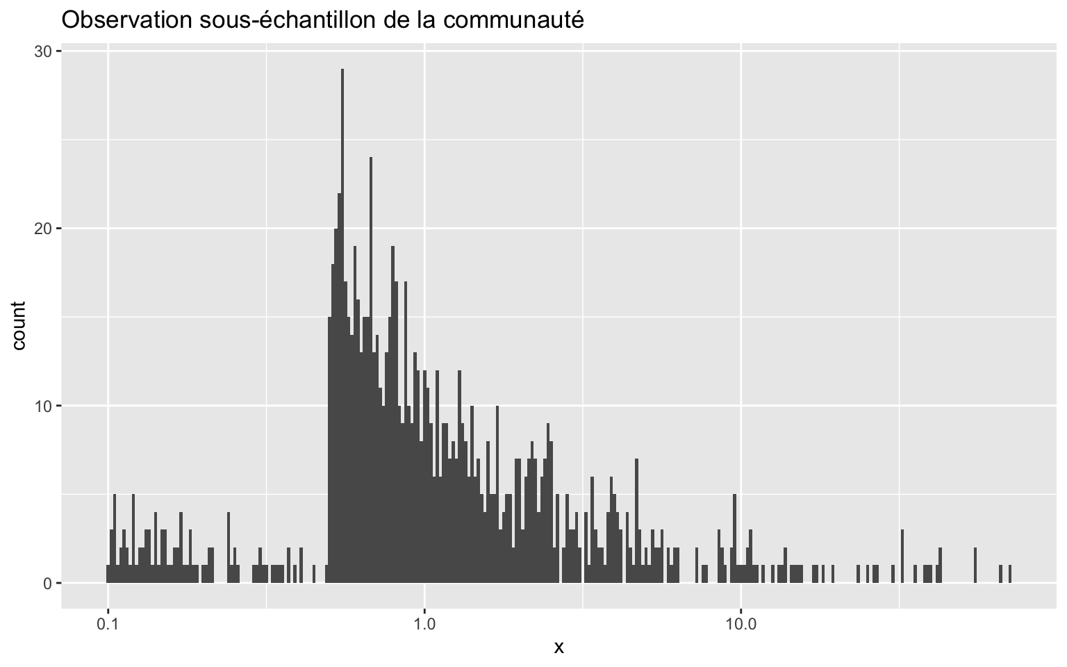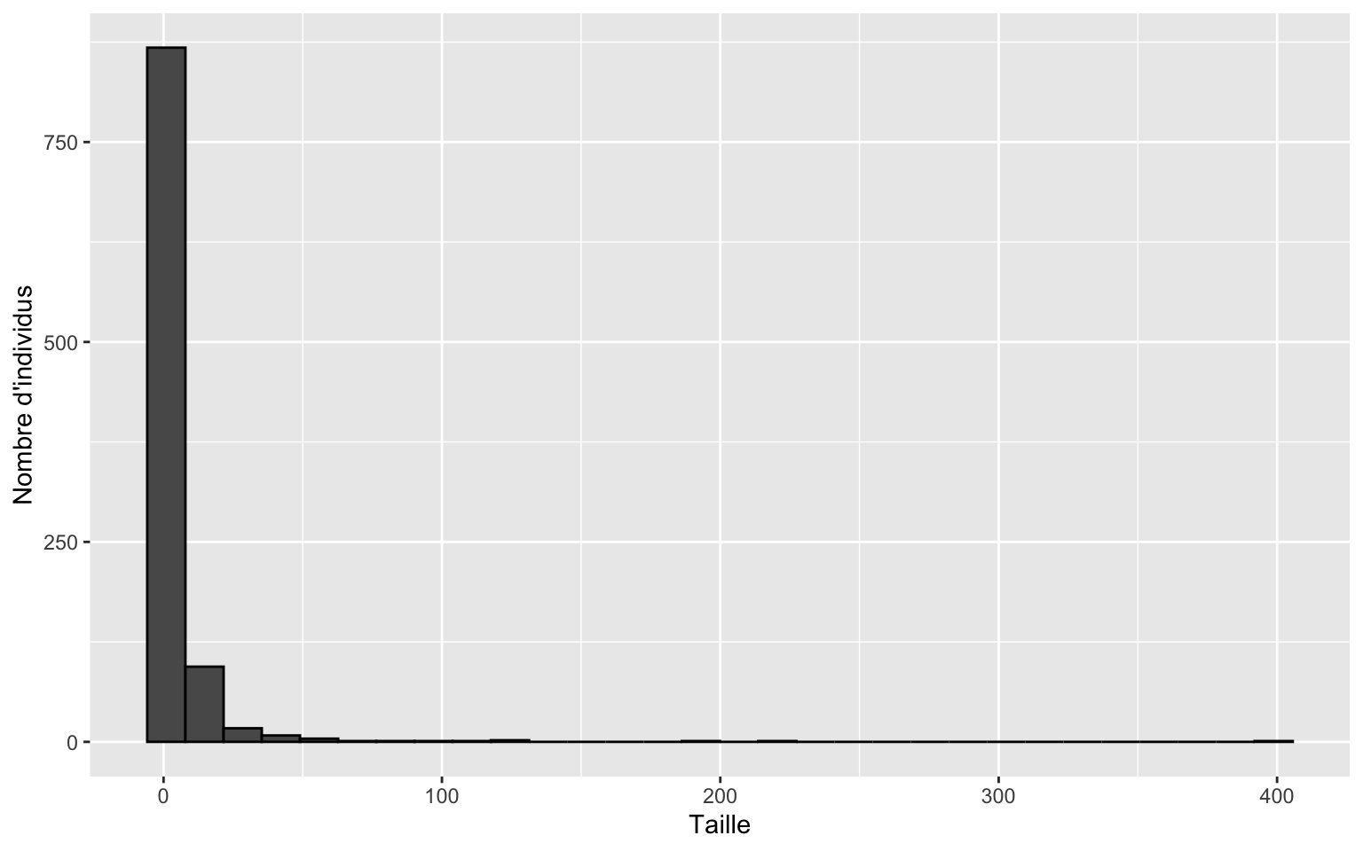 Capturons maintenant 1000 individus dans cette communauté et observons la distribution des tailles de notre échantillon.
