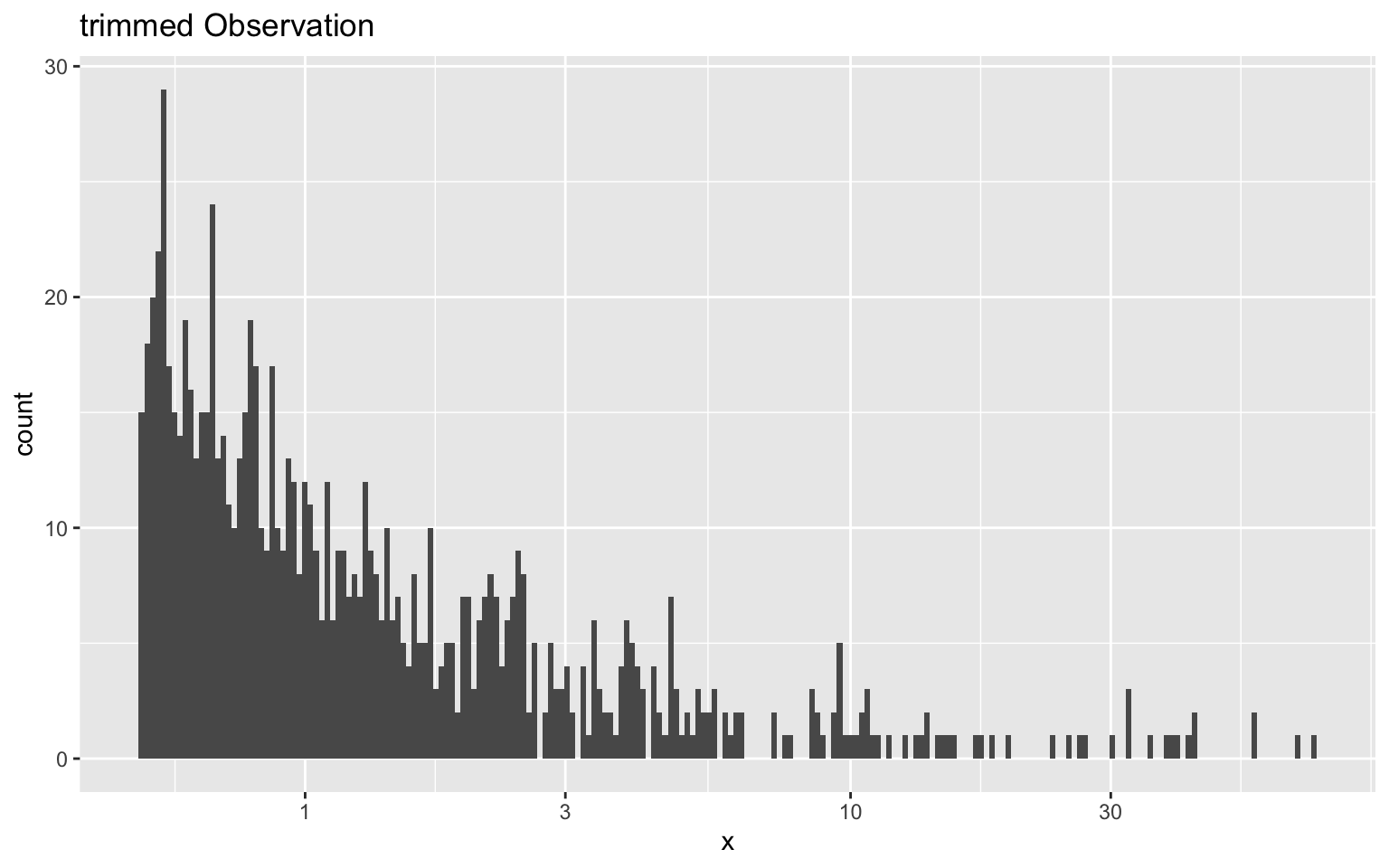 Nous allons donc créer un nouveau jeu de données (trim1) en retirant toutes les observations situées sous le seuil. Nous ne gardons que la “queue” de la distribution qui suit fidèlement la loi de puissance.
