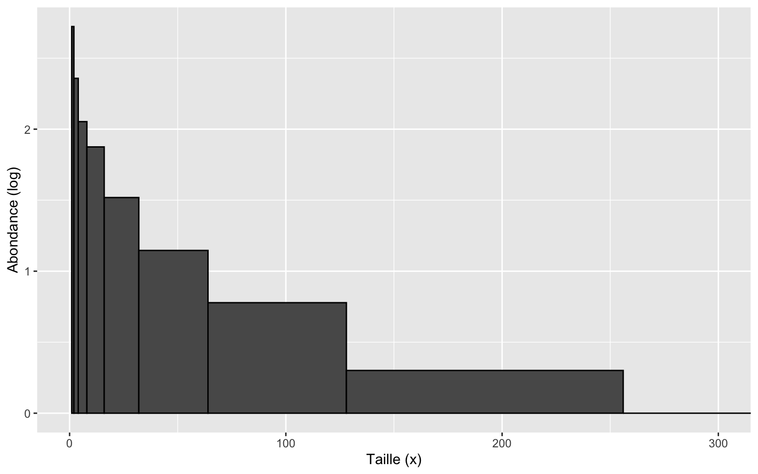 Pour mieux gérer le fait qu’il y a beaucoup plus de petits individus que de gros, on peut aussi utiliser des largeurs de classes variables tout en laissant les tailles en valeurs non-transformées. On peut ainsi augmenter la largeur de classes par un facteur de 2 pour que chaque nouvelle classe soit deux fois plus large que la précédente.