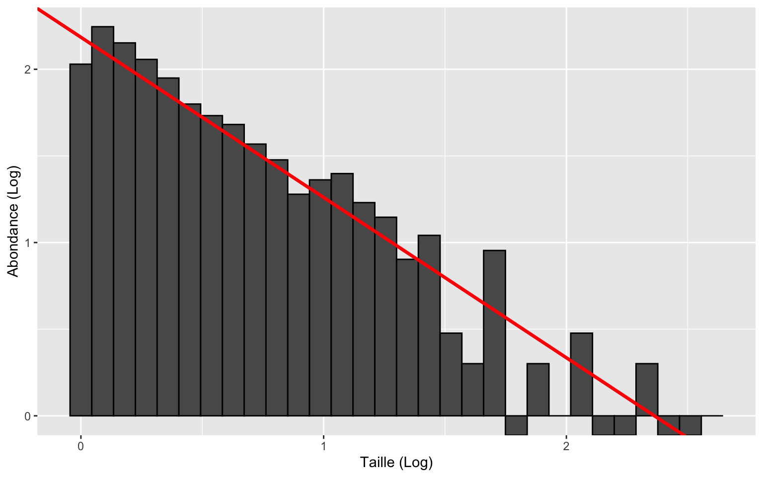 Grâce à la transformation log des deux variables, la relation entre l’abondance et la taille a désormais une apparence linéaire. C’est le point de départ de l’analyse des spectres de tailles. Il devient possible de créer un modèle linéaire et la pente de ce modèle peut servir de métrique standardisée pour comparer différentes communautés en termes de composition des tailles.